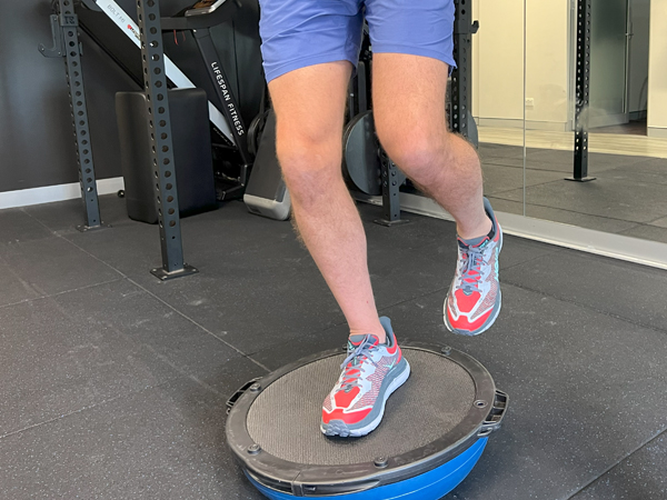 Place one foot on one side of the BOSU or wobble board and then step on with the other. You may want to start holding onto something for balance.