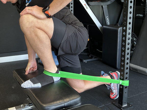 To help increase dorsiflexion ankle ROM using a powerband to assist the AP glide of the talus. Useful for stiff ankles after an ankle sprain or surgery where there is loss of dorsiflexion ROM and capsular impingement.