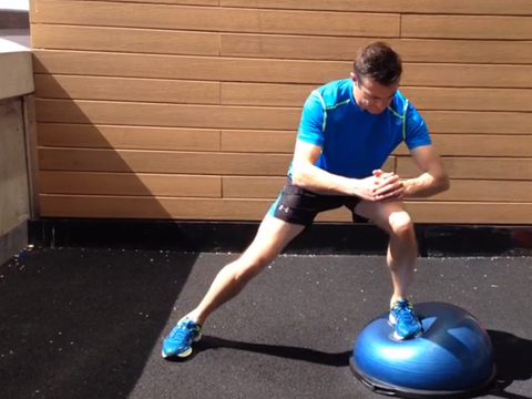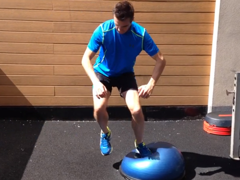 Stand with knees slightly bent, feet hip width apart, side on to the BOSU. Aim to jump not onto the top of the BOSU and not onto the side but somewhere in between. Land with a bent knee and 'stick' the jump, making sure you do not allow ankle to roll or knee to roll in trying to control your landing. Start close and then move further away as you get better.