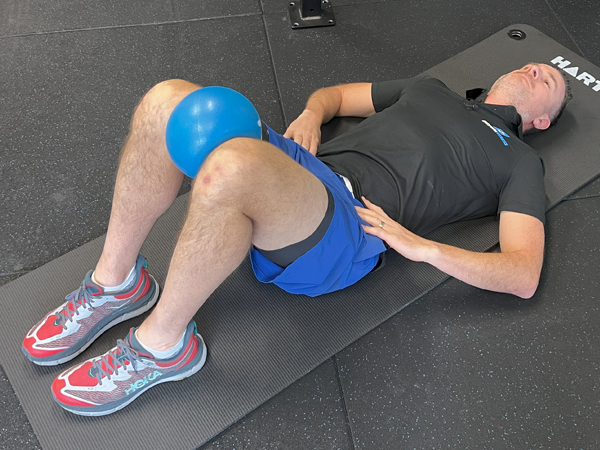 Keep your back in neutral and push the knee directly into the ball and hold a maximum static contraction without pain. Fatigue should be felt in the lateral gluts deep in the lateral hip. Special Notes