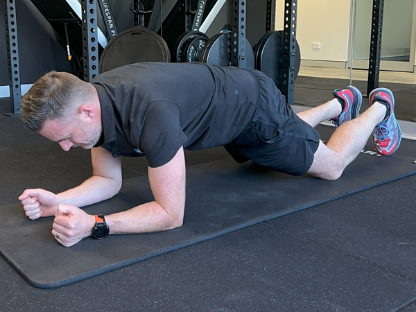 |  Lean on a wall on your forearms and toes on the ground. Push your upper body slightly away from the wall to flatten the upper back between your shoulder blades - but don't round your spine. Tilt the pelvis so your lumbar spine is in neutral. Stiffen and activate the core, then 'anti-shrug' your shoulders to switch on your lats, as well as clench your buttocks to activate your glutes. Make sure your knee are straight and the thigh muscles are on. Hold this position and keep breathing, for 10sec up to 60sec.