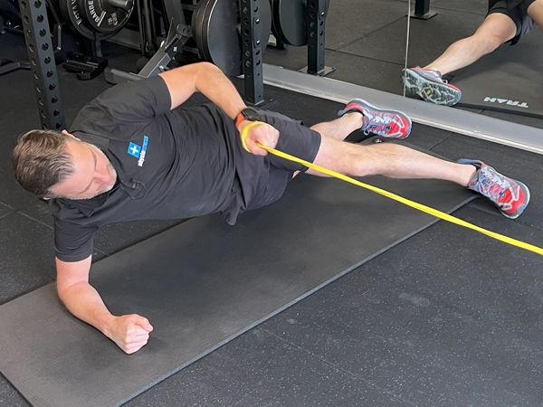 Targets isometric strengthening of the Quadratus Lumborum, Obliques and Glutes biased to one side - an essential lumbar spine 'core" strength exercise.