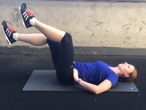Set neutral spine, and DRAWING UP AND IN your pelvic floor to activate your deep transverse abdominus. Then add on the 'shortening the scar' technique to increase the TA contraction. Maintain your deep pelvic floor abdominal activation and without holding your breath, letting your back arch or flatten into the floor. Don't let your tummy 'dome up' or sink in (don't suck your belly button down). You should be aiming to have a flat tight abdominal wall but still breath normally through your rib cage.