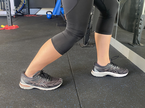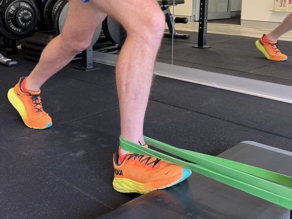 Stand with toe resting on wall and heel on floor. Other leg behind you. Use hands to support yourself against wall. Bend both knees and slowly lean towards wall until you feel stretch in the back of your calf. Hold for 30 seconds